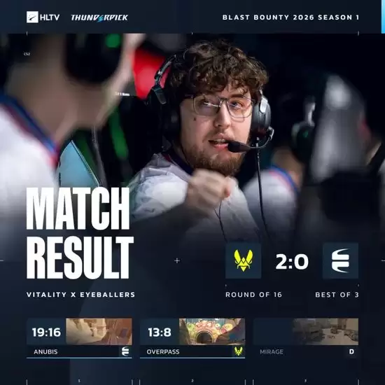 此前,EYEBALLERS在BLAST赏金赛S1 2026第二阶段以0-2不敌Vitality,最终位列赛事第9-16名。