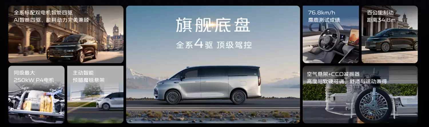 在智能驾驶领域,吉利银河V900搭载“千里浩瀚辅助驾驶H5”方案,配备1颗激光雷达、3颗毫米波雷达、11颗摄像头和12颗超声波雷达,计算平台基于英伟达Orin芯片打造。该系统主打无高精地图依赖的端到端领航辅助驾驶,以及覆盖超过300种车位类型的自动泊车功能,为驾驶者提供更加安全、便捷的出行体验。动力方面,新车全系标配双电机智能四驱系统,系统综合峰值功率达340kW,峰值扭矩523N·m。增程系统由一台热效率高达47.26%的1.5T增程器与前后双电机组成,后电机峰值功率为250kW。在CLTC工况下,纯电续航里程为260km,满油满电综合续航里程可达1220km。底盘配置上,V900配备空气弹簧、CCD连续可变阻尼减振器以及“真魔毯”预瞄式悬架系统,该系统通过双目摄像头扫描路面,提前调整悬架状态,以改善行驶质感,减少颠簸与晃动。值得一提的是,整套底盘的调校工作有路特斯工程团队参与,旨在提升这款大型MPV的操控稳定性。