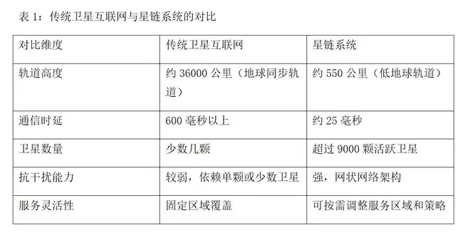 与传统卫星互联网相比,星链的技术参数体现出明显优势。传统系统往往仅由少数几颗高轨道卫星组成,而星链则通过大规模低轨道卫星星座实现全球覆盖。