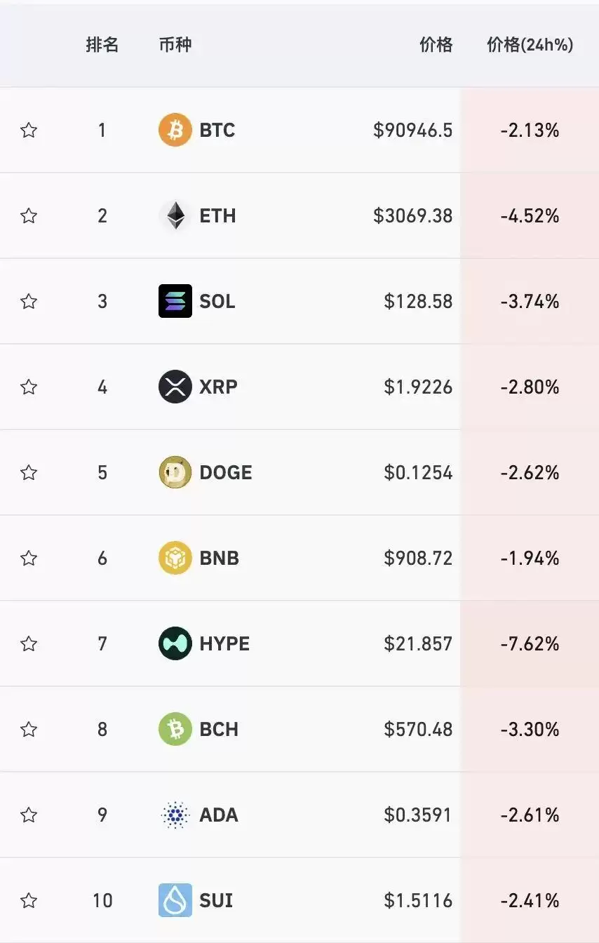 加密货币方面,主要币种全线下跌。比特币价格跌幅超过2%,跌破91000美元;以太坊跌4.52%,狗狗币跌2.62%;近24小时爆仓人数超过12.2万人。