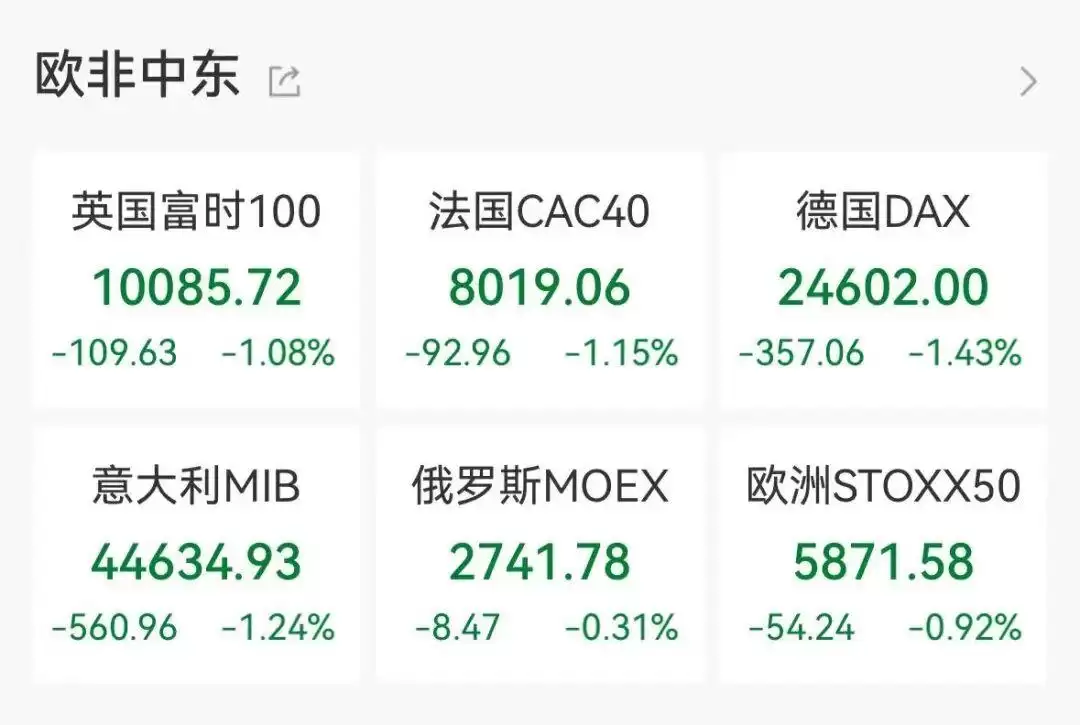 欧洲主要股指集体下挫。欧洲斯托克50指数跌0.92%,英国富时100指数跌1.08%,法国CAC40指数跌1.15%,德国DAX30指数跌1.43%,富时意大利MIB指数跌1.24%。