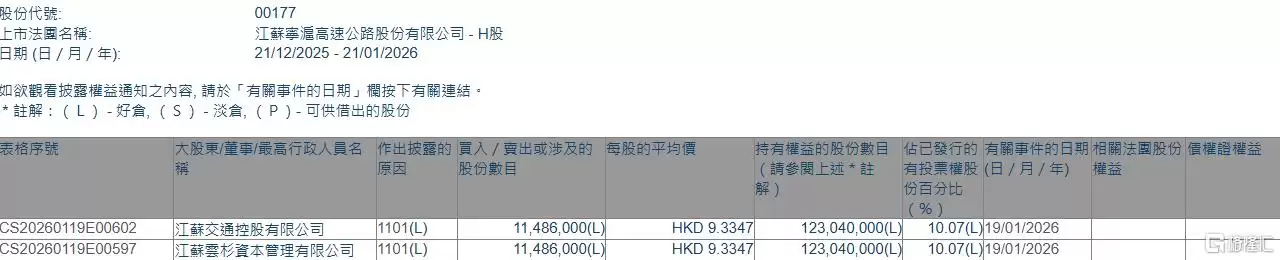 根据联交所最新权益披露资料,江苏宁沪高速公路(00177.HK)于2026年1月19日获江苏云杉资本管理有限公司在场内以每股均价9.3347港元增持1148.6万股,涉及资金约1.07亿港元。