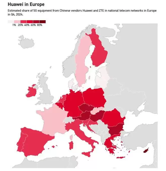 2024年第四季度,华为、中兴在欧洲国家电信网络中所占的5G设备份额评估 Politico EU制图