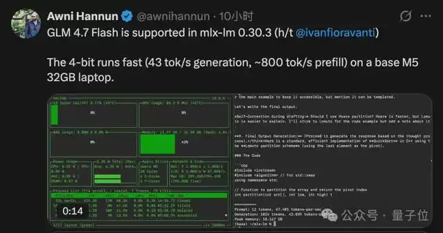 在本地部署方面,经过开发者实测,在配备32GB统一内存、M5芯片的苹果笔记本上,推理速度可以达到每秒43个token。