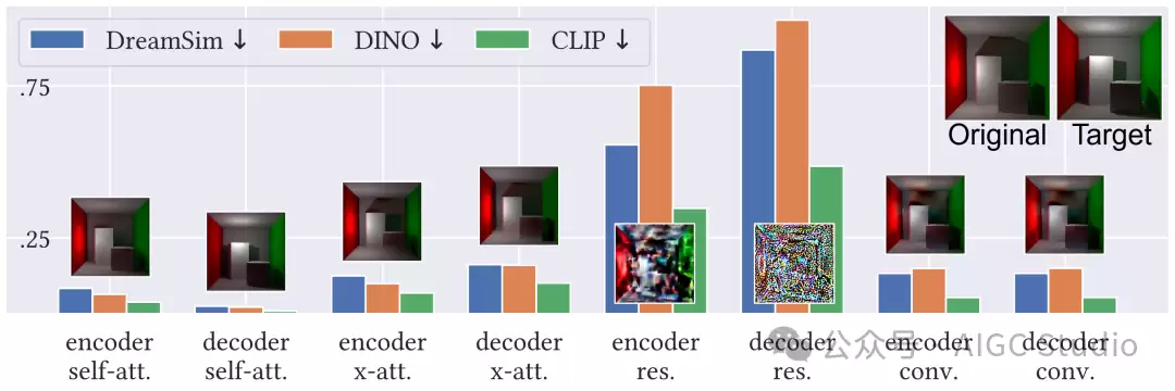 为了研究哪些网络层编码了光传输现象,论文进行了一项特征注入实验:将从重照明图像生成过程中提取的激活信号,注入到原始图像(来自同一场景)的生成过程中。我们发现,光传输效应主要编码在自注意力层中,尤其是在基于UNet的扩散模型(如SD 1.5)的解码器部分。这并不奇怪——我们推测自注意力机制中的多对多交互类似于光传输中的交互,这使得这些层成为编码此类效应的天然场所。从这个意义上说,自注意力可以作为光传输建模的归纳偏置。