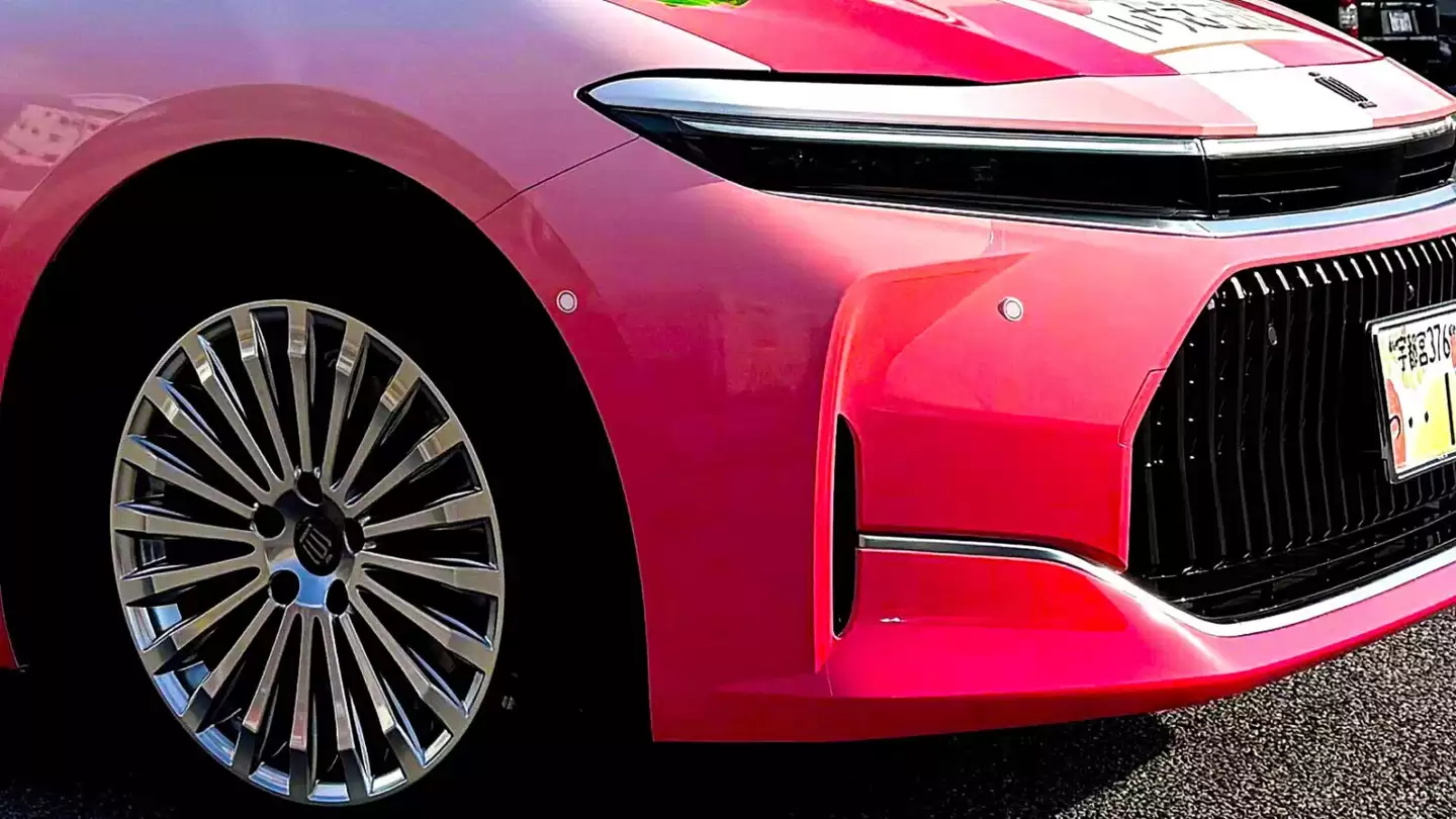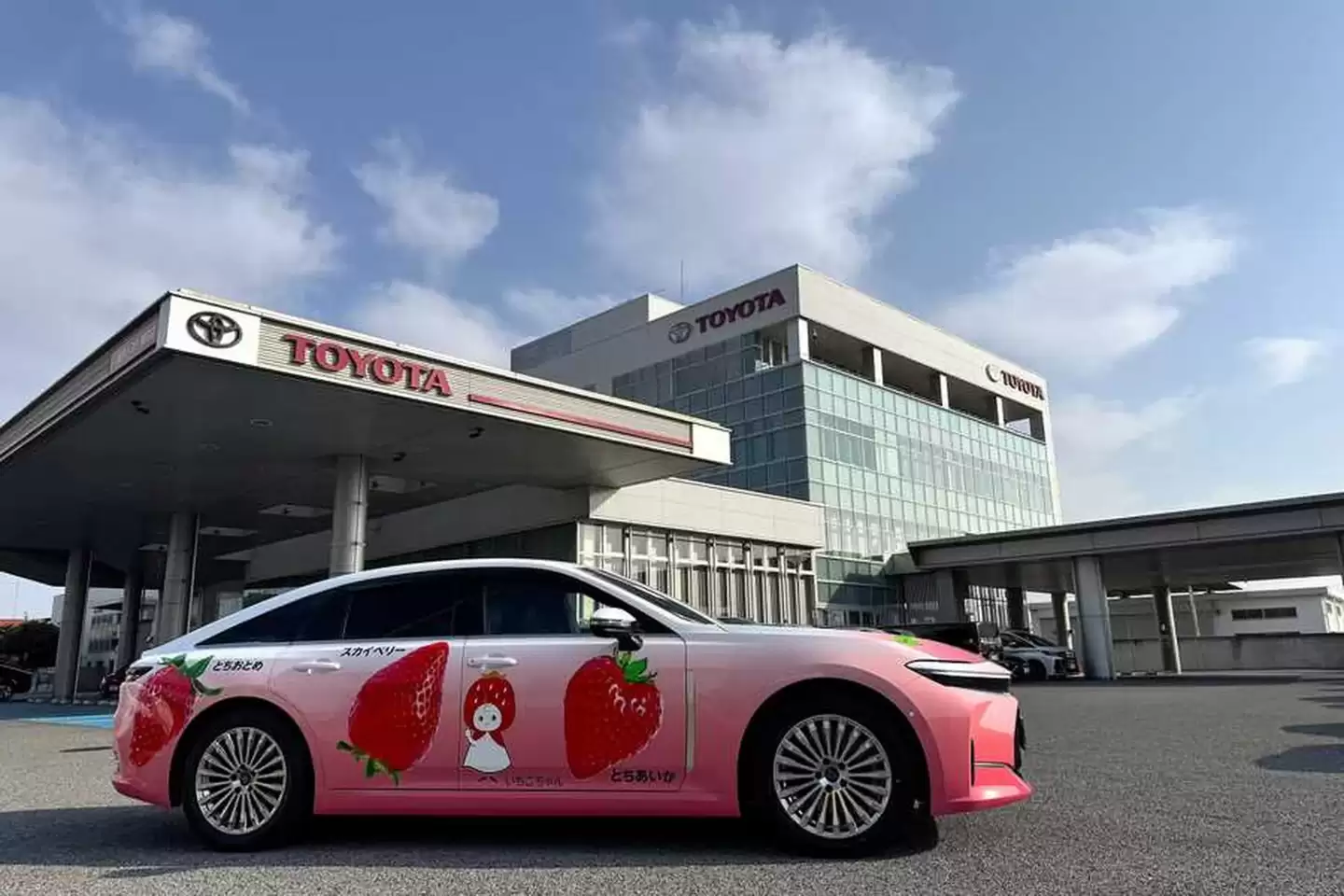 外觀方面,車身採用大膽的粉色基底,搭配柔和的白色漸變,視覺效果宛如精致的甜點推車,而非傳統的行政座駕。車身側面繪製了「Tochiotome」、「Tochiaika」和「Skyberry」等當地著名草莓品種的圖案,引擎蓋上還繪有一座粉色城堡。這些設計進一步增強了車輛的俏皮感與親和力,車身還融入了「Tochimaru-kun」等三個卡通吉祥物形象。
