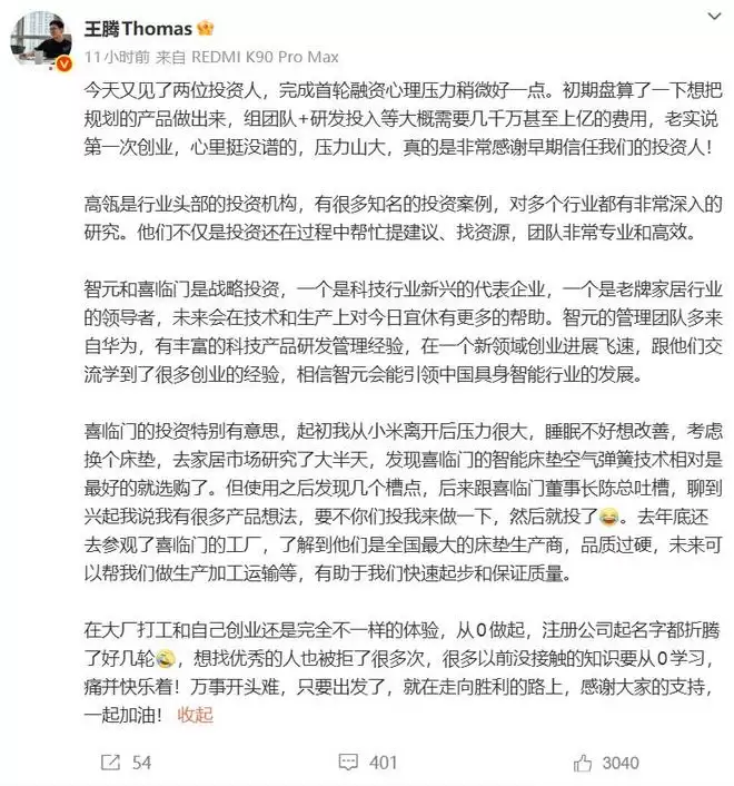 1月21日深夜,原小米双料总经理王腾在社交平台发了一条动态,既感叹了创业的不易,也对投资机构们表达了一番感谢。