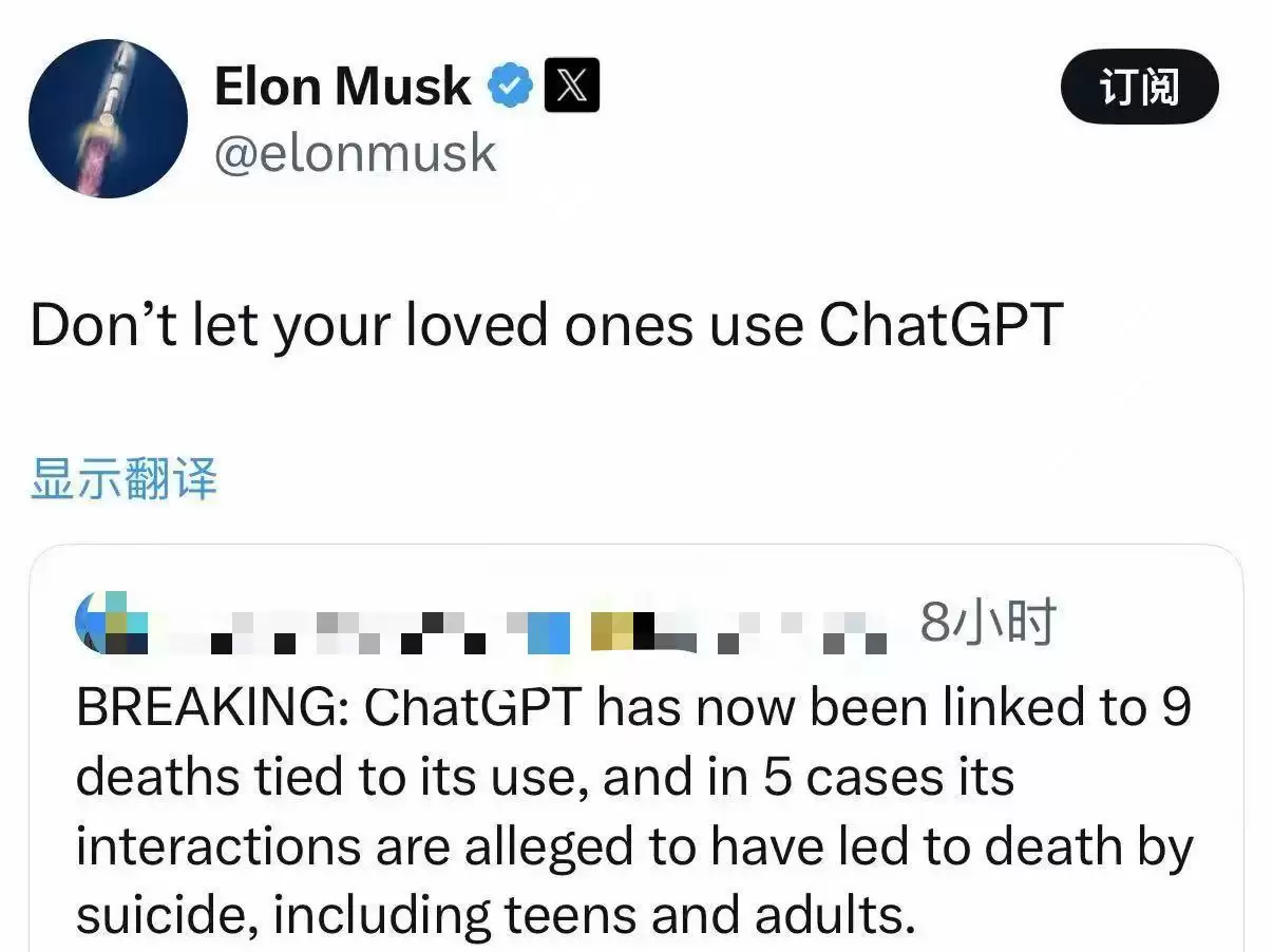 马斯克在其社交平台X上率先发难,转发了一条关于ChatGPT的帖子并附上评论。该帖子声称,ChatGPT目前已被证实与9起死亡事件有关,其中5起事件据称是由于其互动诱导导致自杀身亡,受害者包括青少年和成年人。