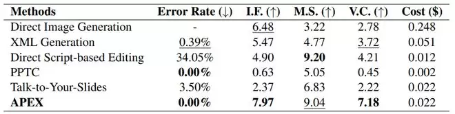 团队在APEX-Bench上进行了广泛评测。实验对比了图像生成(Direct Image Generation)、XML生成(XML Generation)、基于python脚本的直接编辑(Direct Script-based Editing)、通用PPT Agent的方法(PPTC、Talk-to-Your-Slides)以及我们提出的APEX方法。