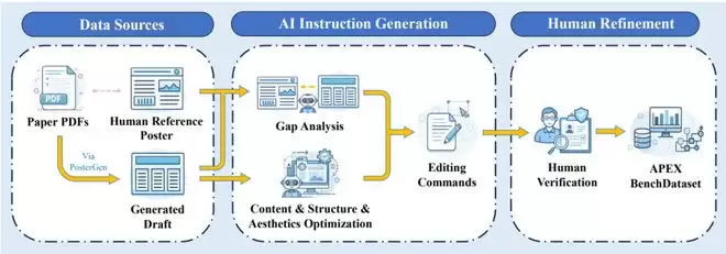 数据源与PosterGen:为模拟学术论文合成与编辑全流程自动化场景,数据集中的海报统一使用PosterGen这一兼具良好美学设计与内容组织的自动学术海报生成框架合成。
