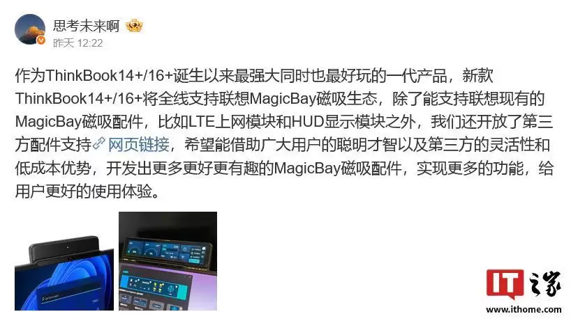 1 月 21 日消息,联想产品经理 @思考未来啊 昨日在微博表示,新款(即 2026 款)ThinkBook 14+ 16+ 笔记本电脑将全线支持联想的 Magic Bay 磁吸生态;同时,自