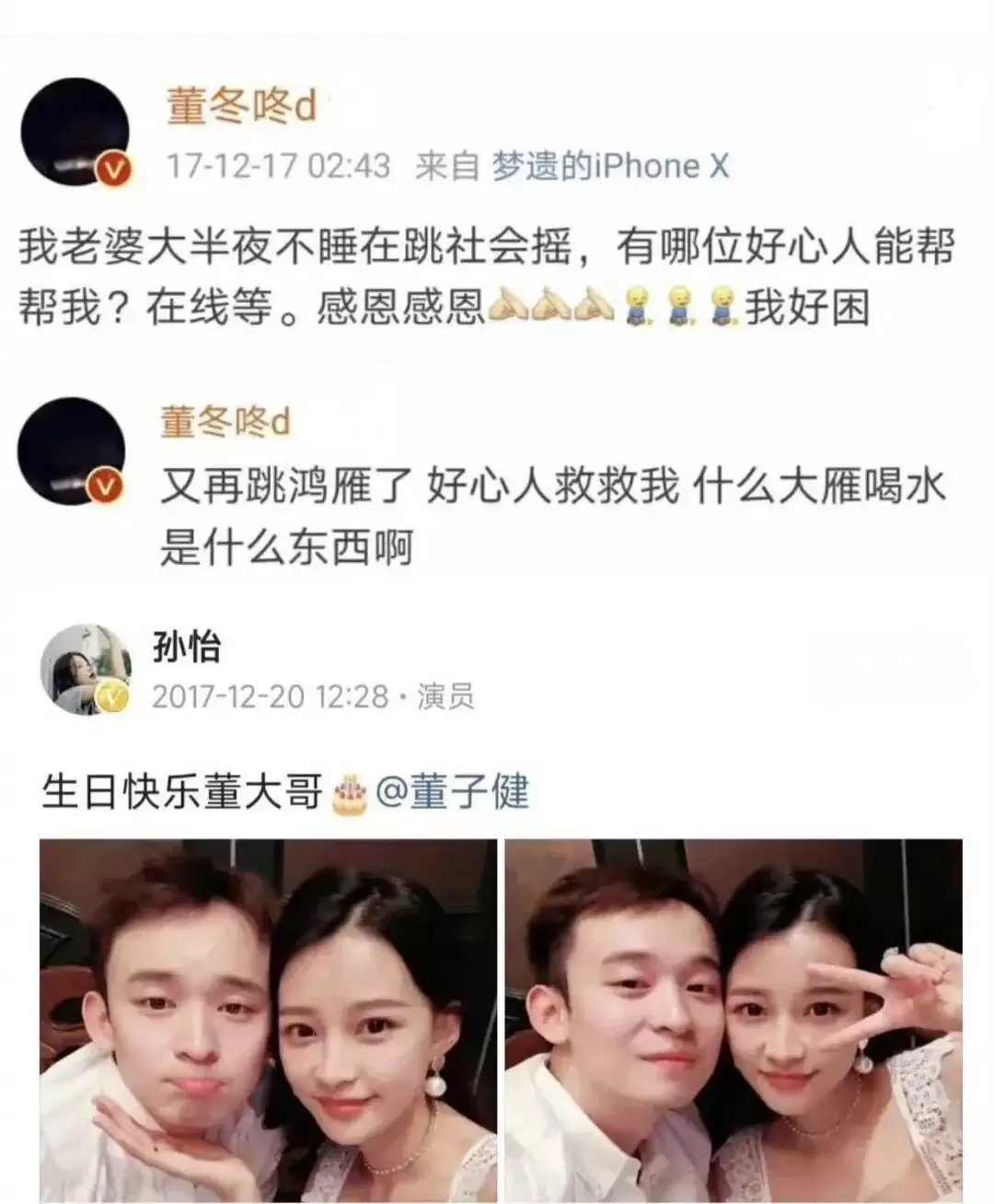 董子健会在半夜发“我老婆不睡觉在跳社会摇”的动态来求助网友,看似苦恼,实则狗粮撒得一把又一把。