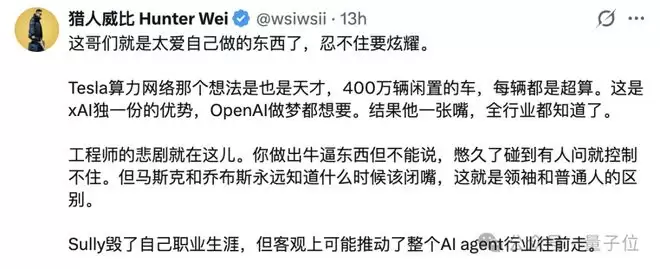这哥们就是太爱自己做的东西了,忍不住要炫耀。Tesla算力网络那个想法是也是天才,400万辆闲置的车,每辆都是超算。这是xAI独一份的优势,OpenAI做梦都想要。结果他一张嘴,全行业都知道了。工程师的悲剧就在这儿。你做出牛的东西但不能说,憋久了碰到有人问就控制不住。