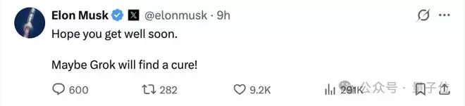 推文发布后,老板马斯克也第一时间留言慰问,祝他早日康复,并顺手cue了一下Grok: