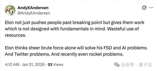 马斯克不仅把人逼到崩溃边缘,还经常让大家做一些没有遵循基本原理、从一开始就设计不合理的工作,导致资源被大量浪费。他认为只要靠蛮力就能解决FSD和AI的问题,也能解决Twitter的问题,最近甚至连火箭的问题也是如此。
