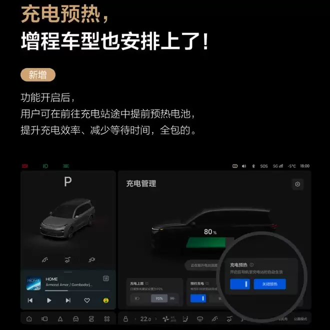 智能电动方面,新增增程车型充电预热功能,理想L系列在导航前往充电站途中将提前预热电池,使其达到最佳充电温度区间,从而有效提升充电效率。
