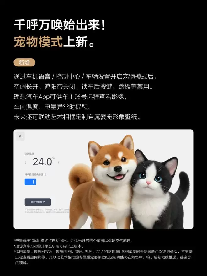 在理想汽车OTA8.2版本升级中,智能座舱新增了宠物模式,确保宠物滞留车内时座舱保持空气流通且温度适宜,用户还可以使用理想汽车App远程查看座舱内实时影像。
