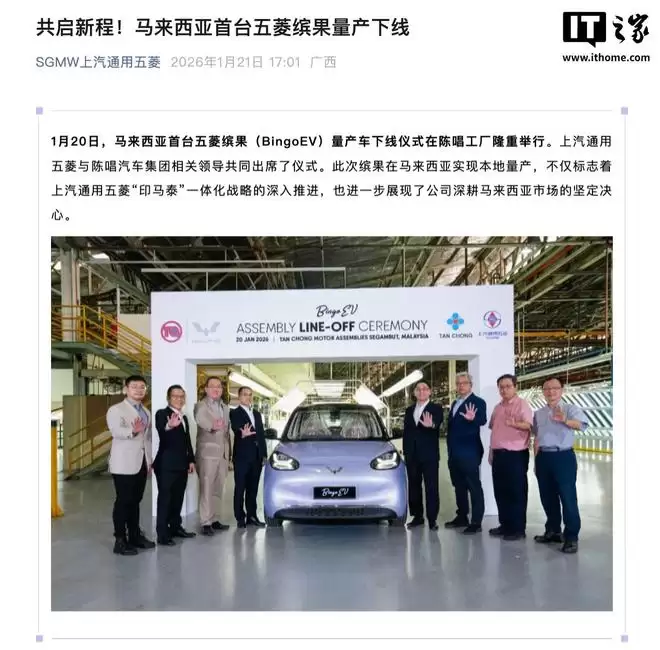 1月21日,据IT之家消息,上汽通用五菱于今日傍晚通过官方公众号宣布,其马来西亚首款量产车五菱缤果(BingoEV)已于1月20日在当地陈唱汽车集团工厂正式下线。上汽通用五菱与陈唱汽车集团的相关领导共同见证了这一重要时刻。