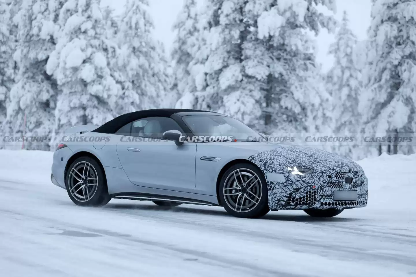 汽车媒体CarScoops近日曝光了一组梅赛德斯-AMG SL中期改款车型的冬季路测谍照。这款自2024年秋季问世的高性能跑车,在经历近四年的市场检验后,即将迎来首次重大升级。测试车在极寒环境下展现出全新设计语言,前脸伪装虽厚重,但标志性三叉星徽大灯依然清晰可辨。
