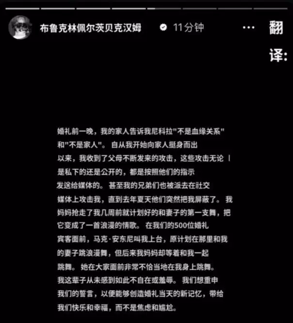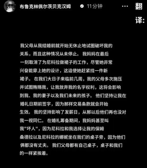 而布鲁克林所谓的“入赘”,似乎也有自己的隐情:“我的父母多次施压并试图贿赂我,让我放弃我的名字权利,这将会影响到我、我的妻子以及我们未来的孩子。”