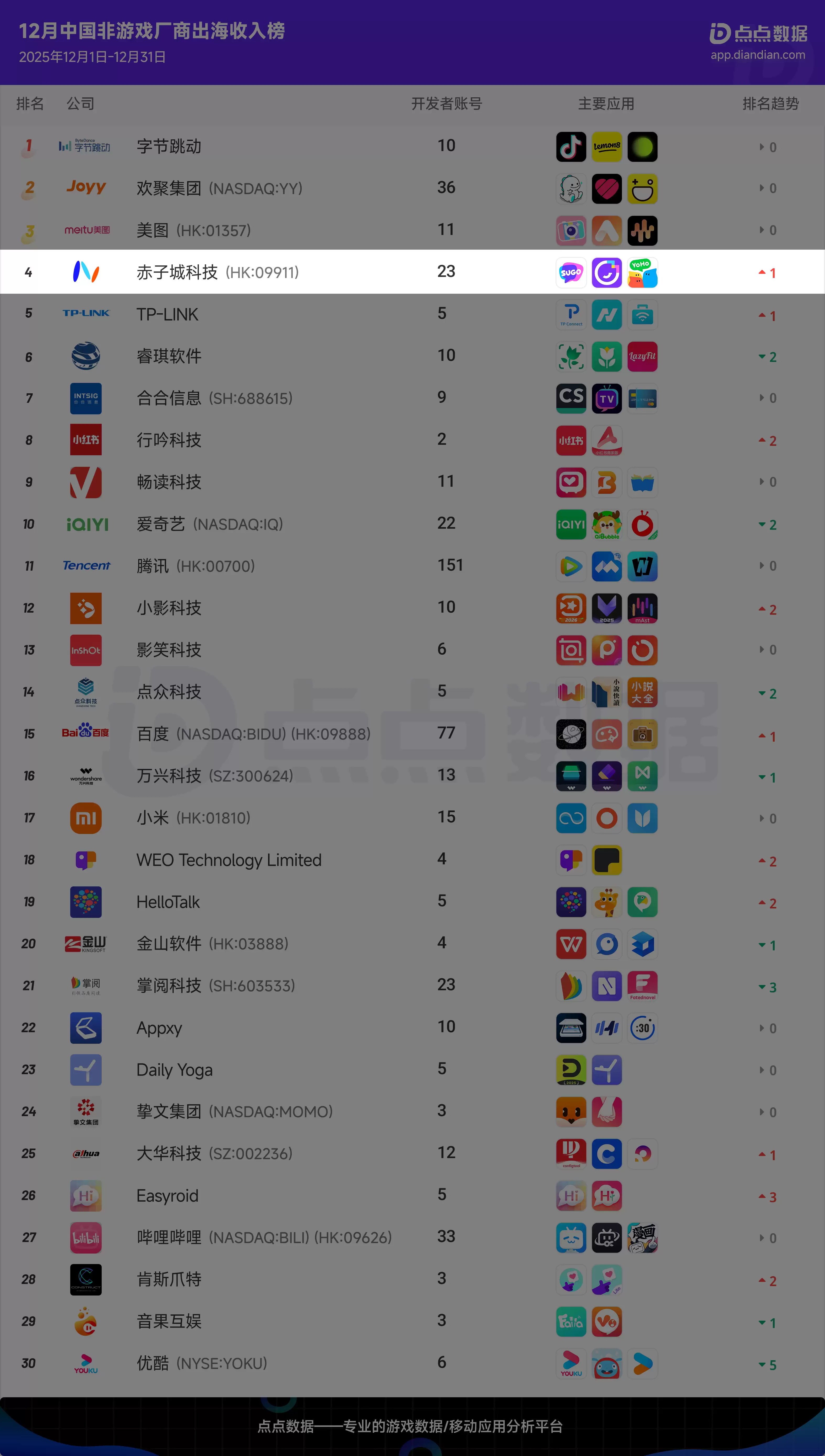 2025年12月,公司在点点数据发布的“中国非游戏厂商出海收入榜”中位列第4名,较前期攀升1位,彰显出强劲的发展势头。