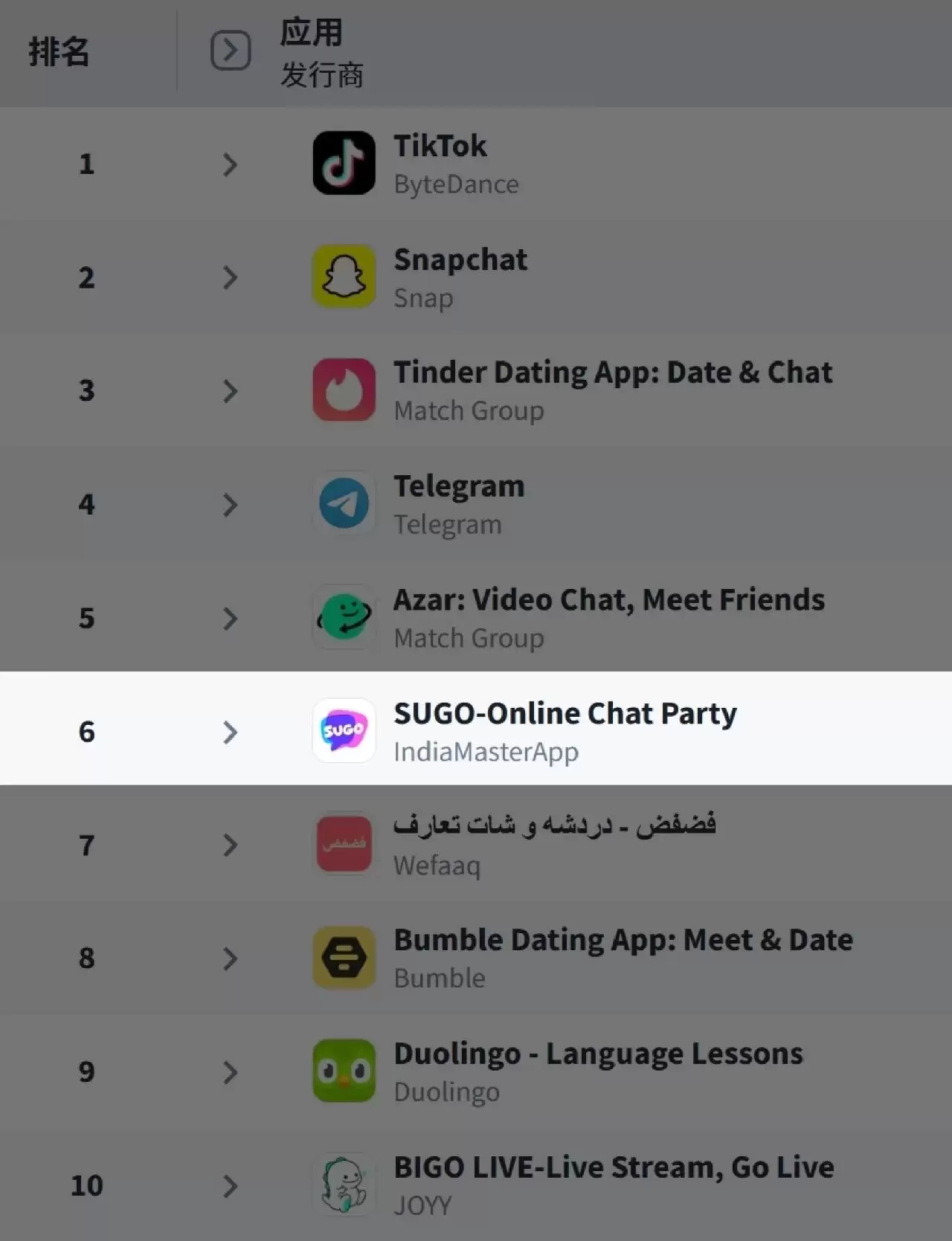 2025年第四季度,陪伴社交平台SUGO在Sensor Tower中东地区社交网络类别收入排行榜中位列第6名,排名相较2024年持续上升,头部地位进一步夯实;游戏社交平台TopTop通过深度的本土化运营与日益完善的UGC生态,在沙特等高价值市场已成长为“国民级应用”。
