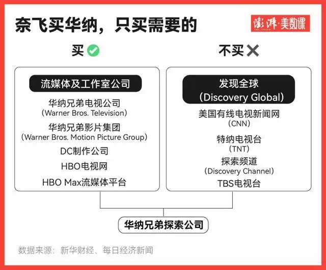所以奈飞想收购的也仅仅是华纳兄弟的IP、内容库和制作能力,而非全盘收购。根据协议,奈飞将收购华纳兄弟,包括其电影和电视工作室、HBOMax流媒体和HBO。华纳兄弟必须在交割前完成有线电视业务剥离,包括CNN、TBS、TNT等有线电视频道均不在收购范围内。