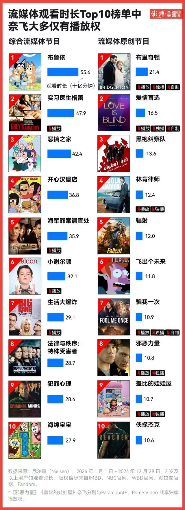 尼尔森的数据显示,在2024年综合流媒体节目排行中,Netflix多以“播放方”而非“版权方”身份出现,虽在流媒体原创内容榜上有名,但节目观看时长远低于经典热播剧。也就是说,虽然奈飞在“爆款制造”方面成绩斐然,但与订阅变现挂钩的观看时长,还是得靠外购的“长青经典IP”。