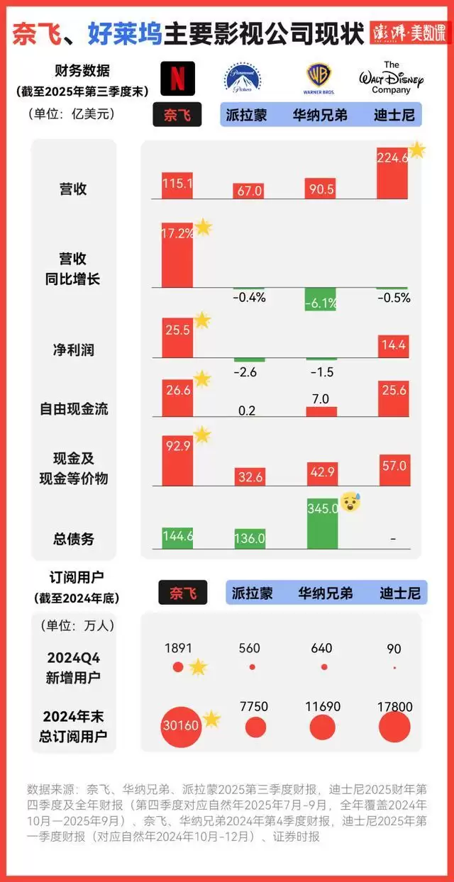 财报数据显示,传统好莱坞巨头们的日子并不好过。行业巨头迪士尼的增长已显疲态。另一竞购方派拉蒙在被收购之前,自由现金流为-2.07亿美元,2025年8月被甲骨文创始人之子收购后,三季度末净利润仍未转亏为盈。即便有甲骨文 CEO 埃利森提供的 404 亿美元不可撤销个人担保及家族信托为其参与华纳竞购提供关键资金背书,也难以掩盖其核心业务增长疲软、盈利模式承压的本质问题。