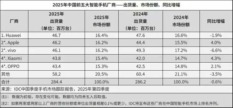 2025年全年,中国智能手机市场总出货量约为2.84亿台,同比小幅下滑0.6%。