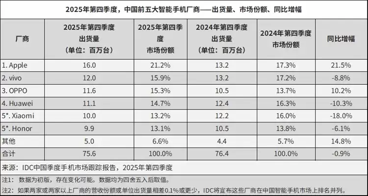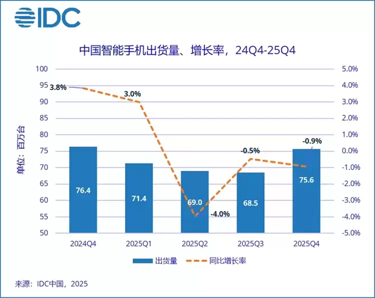 国际数据公司(IDC)最新发布的市场报告显示,2025年第四季度中国智能手机市场的出货量约达7564万台,同比微降0.9%,整体表现趋于平稳。
