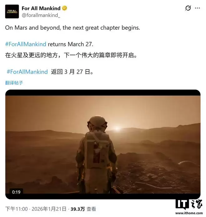 1月22日,据IT之家消息,苹果Apple TV旗下科幻热剧《为全人类》第五季确定将于2026年3月27日(周五)正式回归。本季共10集,系列大结局定于5月29日播出。
