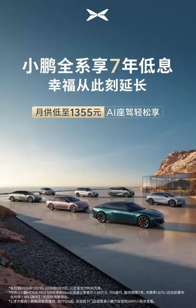 近日,小鹏汽车宣布从1月22日起,正式推出覆盖全系车型的7年低息分期购车方案,成为国内又一家提供超长分期政策的新能源车企。该方案首付比例低至15%起,月供最低仅需1355元,活动有效期持续至2026年1月31日。此次推出的金融方案全面覆盖小鹏旗下所有车型,由小鹏融资租赁提供支持。