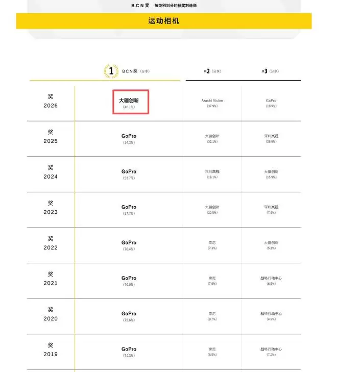 【环球网低空经济频道综合报道】运动相机领域,大疆的崛起正深刻改写市场格局。不仅无人机产品备受瞩目,大疆的运动相机在日本市场也已成为销量冠军。日本权威零售分析机构BCN于2026年1月19日正式向大疆颁发“BCN AWARD 2026”两大年度奖项,大疆一举包揽“数码摄像机”与“运动相机”两大品类的年度销量冠军。尤其在竞争激烈的运动相机领域,大疆凭借Osmo Action系列、Osmo 360全景相机以及Osmo Nano穿戴相机等产品的卓越表现,首次夺得该类目年度销量第一,打破了GoPro在日本市场长达十年的销量垄断地位,标志着大疆在运动影像领域已建立起全面的市场领先优势。