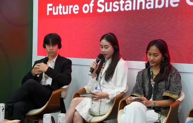 在阿联酋的环保活动展上,何超欣称我们将积极倡导并实践可持续时尚理念,邀请了全球五位顶尖可持续时尚设计师,用凤梨叶纤维、再生塑料等环保材料,结合传统与现代科技,重新定义了时尚与生态的和谐共生。