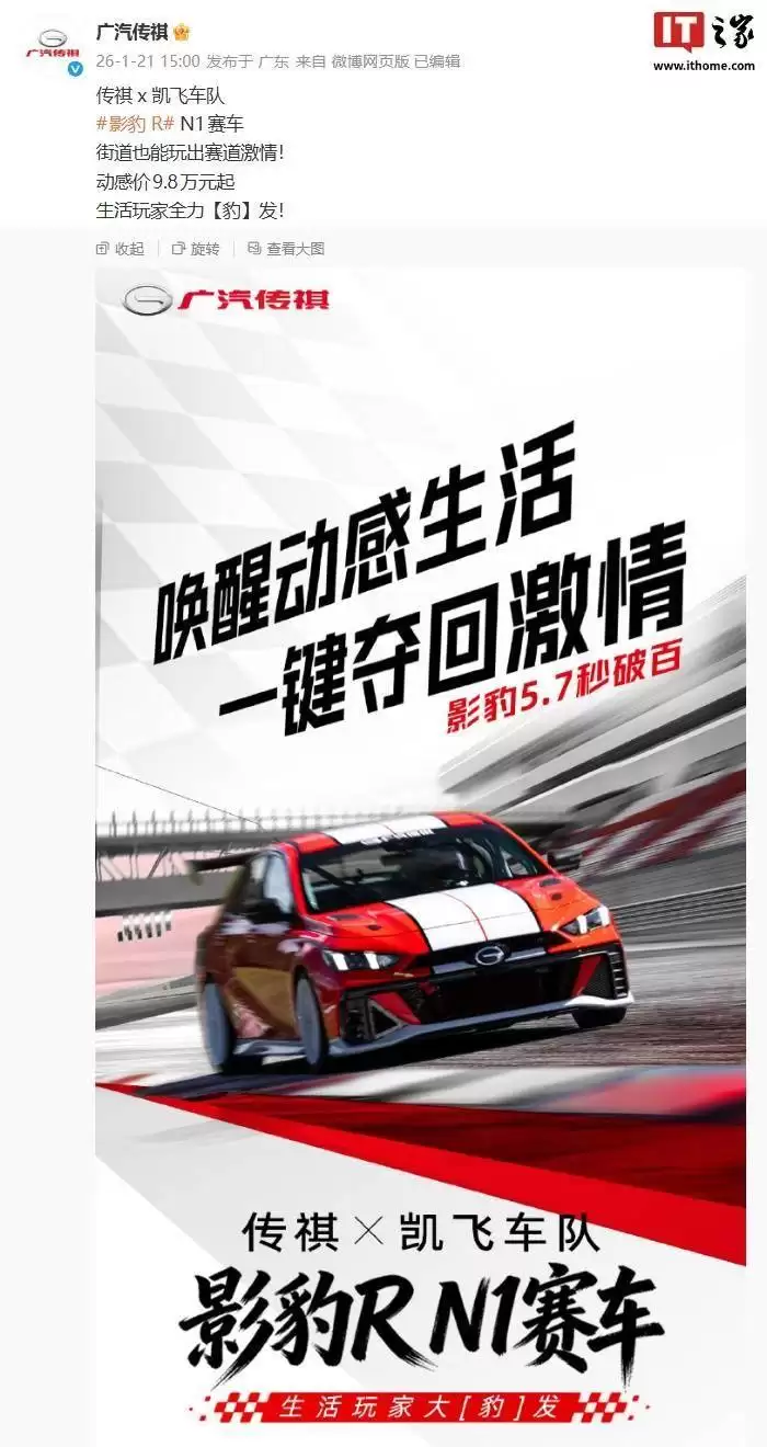广汽传祺与凯飞车队联手,影豹R+N1上市5.7秒破百