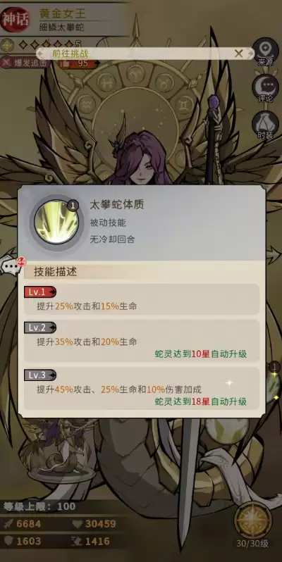 “泰攀蛇体质”是黄金女王的固定被动增益,为她提升25%攻击和15%生命。10星时技能自动升级到二级,此时可以提升35%攻击和20%生命。18星时则拥有45%攻击、25%生命和10%伤害加成。最后的“女神信仰”虽然也是被动,但技能效果比基础增益更强,这里会让黄金女王的普攻强化为【煌雷】,然后造成100%攻击+5%目标生命上限的伤害,这个数值不会超过黄金女王攻击的3倍,且在敌方单位阵亡后可以获得1层【追击】。一直到行动结束之后,就会对敌方随机目标进行1次【煌雷】攻击,每拥有1层【追击】的时候可以额外攻击1次,最多的时候可以攻击到5次。12星的时候这个普攻会强化为造成110%攻击+7%目标生命上限的伤害,让敌方的这个目标阵亡,黄金女王还可以获得1层【追击】的效果,她每拥有1层【追击】就会有额外攻击1次的能力,最多是可以看到增加攻击5次的。