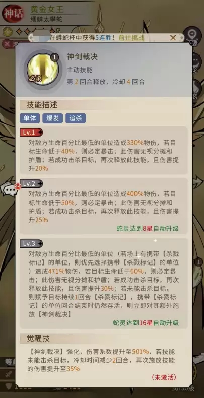 当黄金女王升星至8星时,“神剑裁决”可对敌方生命百分比最低的单位造成400%物理伤害,若该目标生命低于50%,则必定暴击,伤害同样无视分摊和护盾。成功击杀目标带来的追击伤害则提升至25%。当升至16星时,此技能会锁定敌方生命百分比最低的目标。若场上有携带【杀戮标记】的目标,黄金女王会优先选择携带【杀戮标记】的角色作为攻击目标,造成471%物理伤害。若目标生命低于60%,则必定暴击。成功击杀这个敌人后,附加的追击伤害将提升30%的数值。但如果这次追击没有击杀目标,则会赋予该敌人一个持续1回合的【杀戮标记】在身上。如果场上有携带【杀戮标记】的敌人,在回合结束时仍然存活,黄金女王会立即对该目标额外施放一次【神剑】效果。
