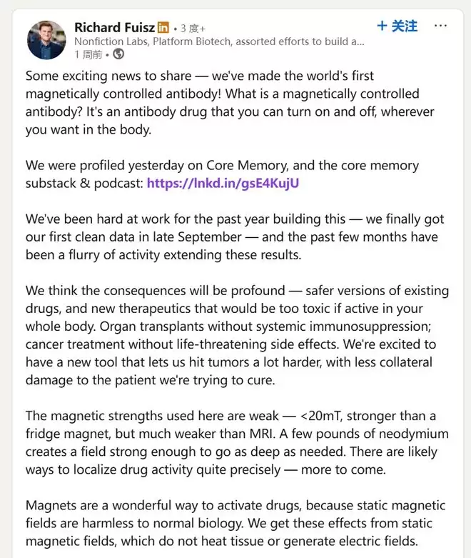近日,生物技术初创公司 Nonfiction Labs 的首席执行官理查德·富伊斯(Richard Fuisz)正式对外宣布:他们成功研制出了世界上第一个磁控抗体(Magnetically Controlled Antibody)。简单来说,它是一种抗体药物,但多了一个隐形开关,可以通过磁场,在患者体内的任何位置,随心所欲地开启或关闭它的活性。