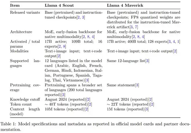 此外,这份报告还总结了“与再分发和衍生命名相关的许可义务,并回顾了公开描述的安全措施和评估实践。其目的是为需要关于Llama 4精确、有来源依据的事实的研究人员和从业者提供一份紧凑的技术参考。”