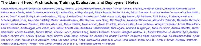 尽管如此,这份报告还是将Llama 4项目的所有参与者都加入了作者名单——超过1300人,足足占了5页篇幅!因此,我们可以大体上认为这份报告就是来自Llama 4团队,尽管其中不少人现在已经从Meta离职,比如前Meta FAIR团队研究总监田渊栋。