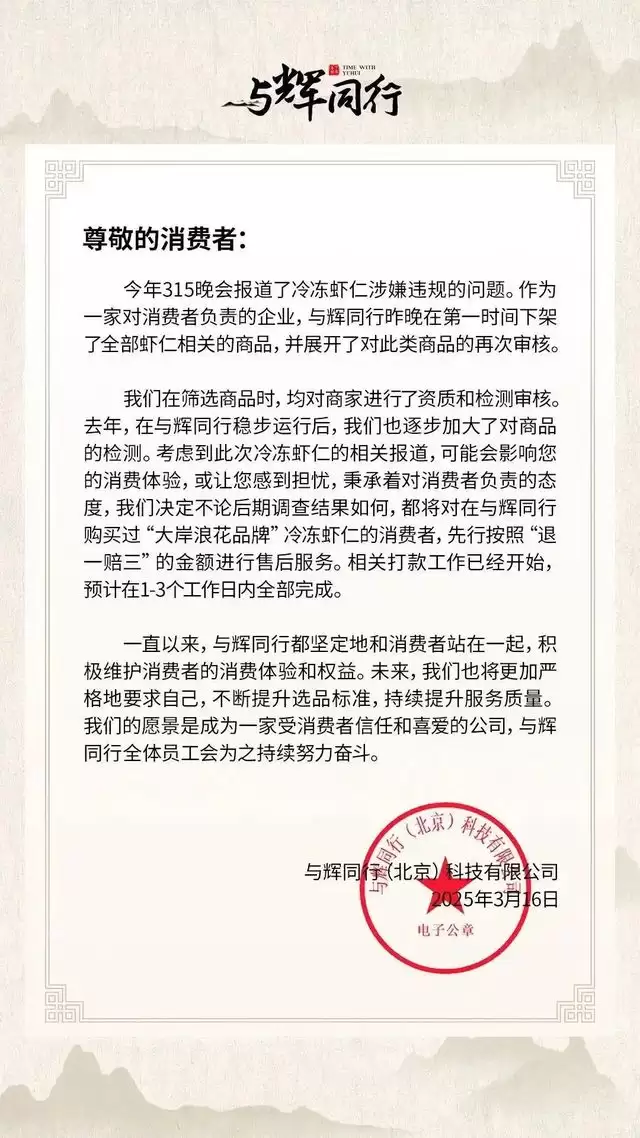 去年315期间,董宇辉再次卷入被曝光的冷冻虾仁风波中,与辉同行迅速发布声明,下架所有虾仁类商品并展开二次审核,启动“退一赔三”标准。
