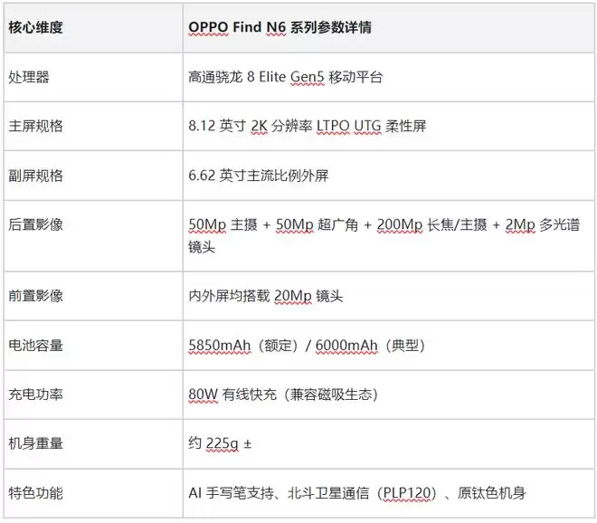 为了让大家更直观地了解OPPO Find N6的硬件跨度,我整理了目前已知的核心参数表: