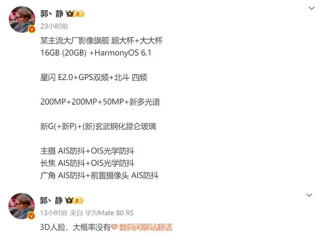 需要注意,主摄和长焦同时使用高像素方案,意味着华为要在全焦段实现数码裁切后的光学品质,尤其是长焦端,2亿像素配合华为自家的XD Optics计算光学,即便在50倍甚至100倍变焦下,画面的细节解析力也将达到前所未有的高度。