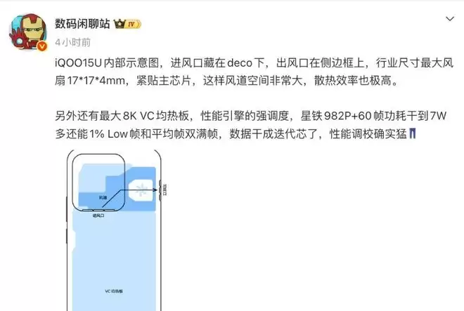 而在此之前,博主@数码闲聊站 的一份爆料中就展示了iQOO 15 Ultra内部示意图,并提到“进风口藏在deco下,出风口在侧边框上,行业尺寸最大风扇17*17*4mm,紧贴主芯片,这样风道空间非常大,散热效率也极高。”