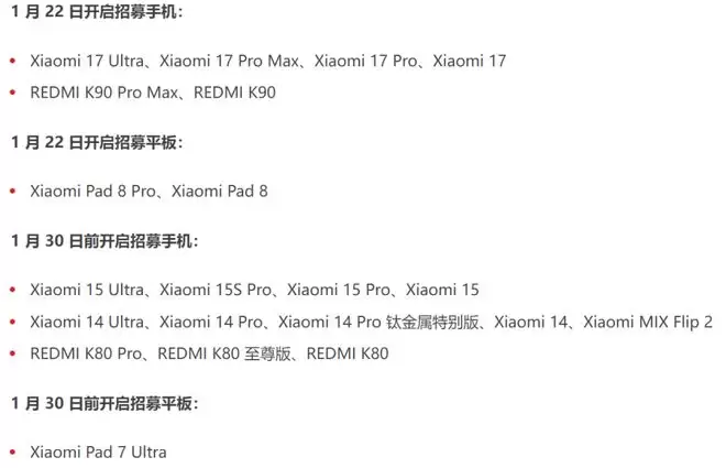 从这次公布的名单来看,小米的节奏明显加快了,本次Beta二期招募采取了分批进行、精准覆盖的策略,主要分为1月22日和1月30日两个关键节点。