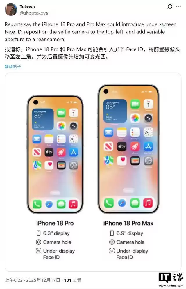 比如《The Information》就多次发布报道,称 iPhone 18 Pro 系列将仅在屏幕左上角保留一个用于前置摄像头的开孔。