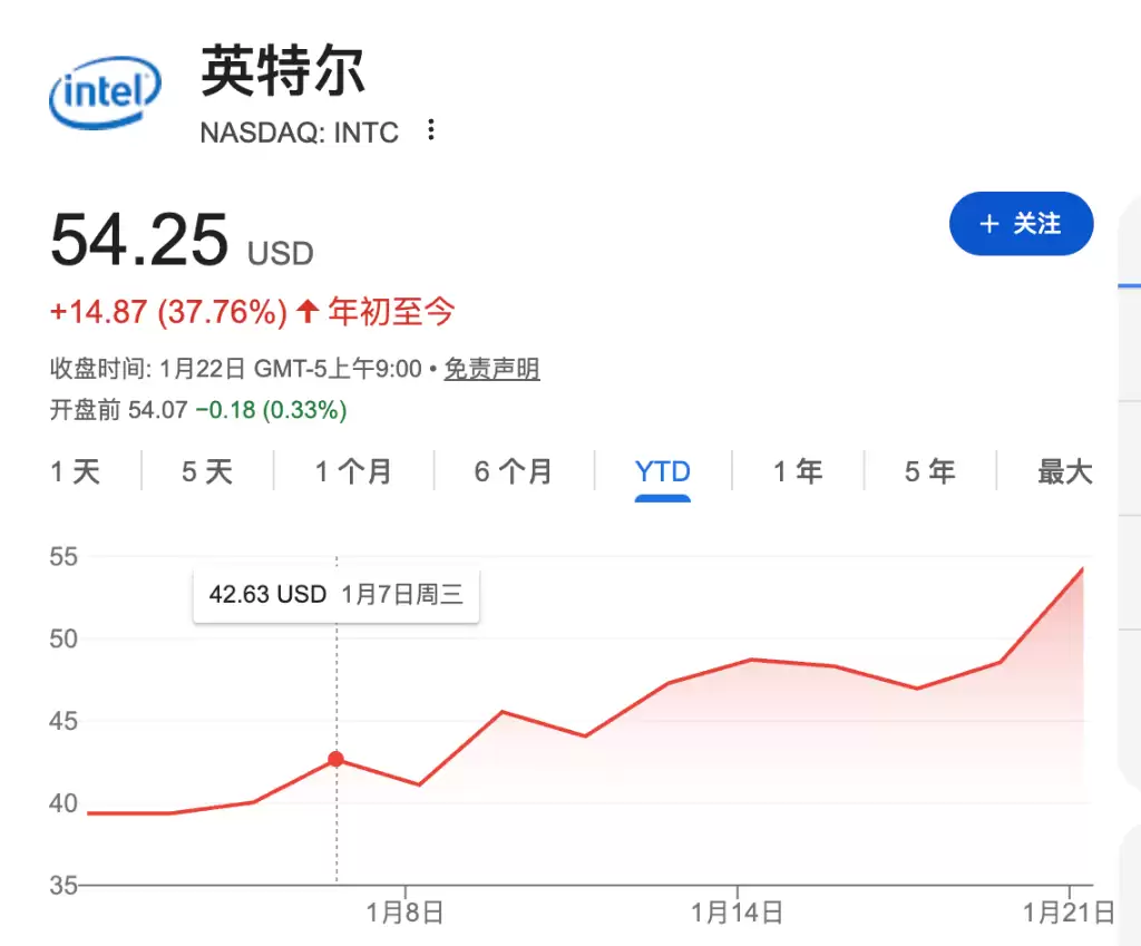进入今年以来,英特尔股价的累计涨幅已达37%,在1月21日收盘时报54.25美元,创下2024年1月以来的新高。当地时间1月22日美股盘后,这家芯片巨头将公布最新季度财报。