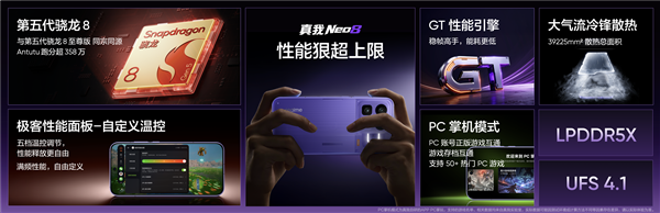 硬件方面,真我Neo8的核心是第五代骁龙8旗舰芯片。这颗芯片采用了先进的3nm制程工艺和全大核设计,在安兔兔平台上轻松跑出超过158万的高分,性能实力可见一斑。