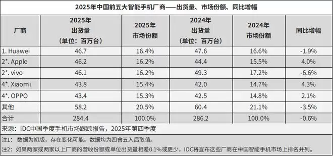 根据IDC数据,2025年全年,华为手机出货量重回中国市场第一,但其出货量相比去年同比下降约2%,与市场大盘整体降福基本持平。